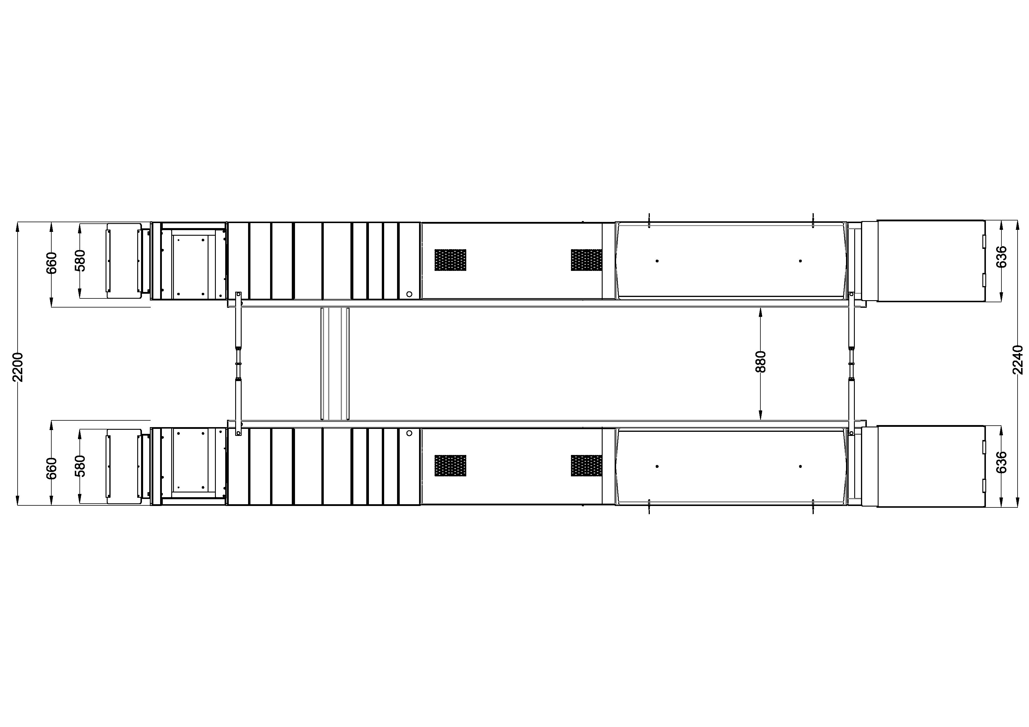 • Mit Aussparungen für Drehplatten vorne, pneumatisch arretierbaren Schwingplatten hinten, Verlängerung der Fahrschienen inkl. Gelenkspieltester, Radfreiheber (Tragfähigkeit: 4 t, Hubhöhe: 450 mm), Laufschienen für den optionalen Achsfreiheber, steckbaren Querverbindungen, 24V-LED-Beleuchtung inkl. Metallschutzbügel und Schalter