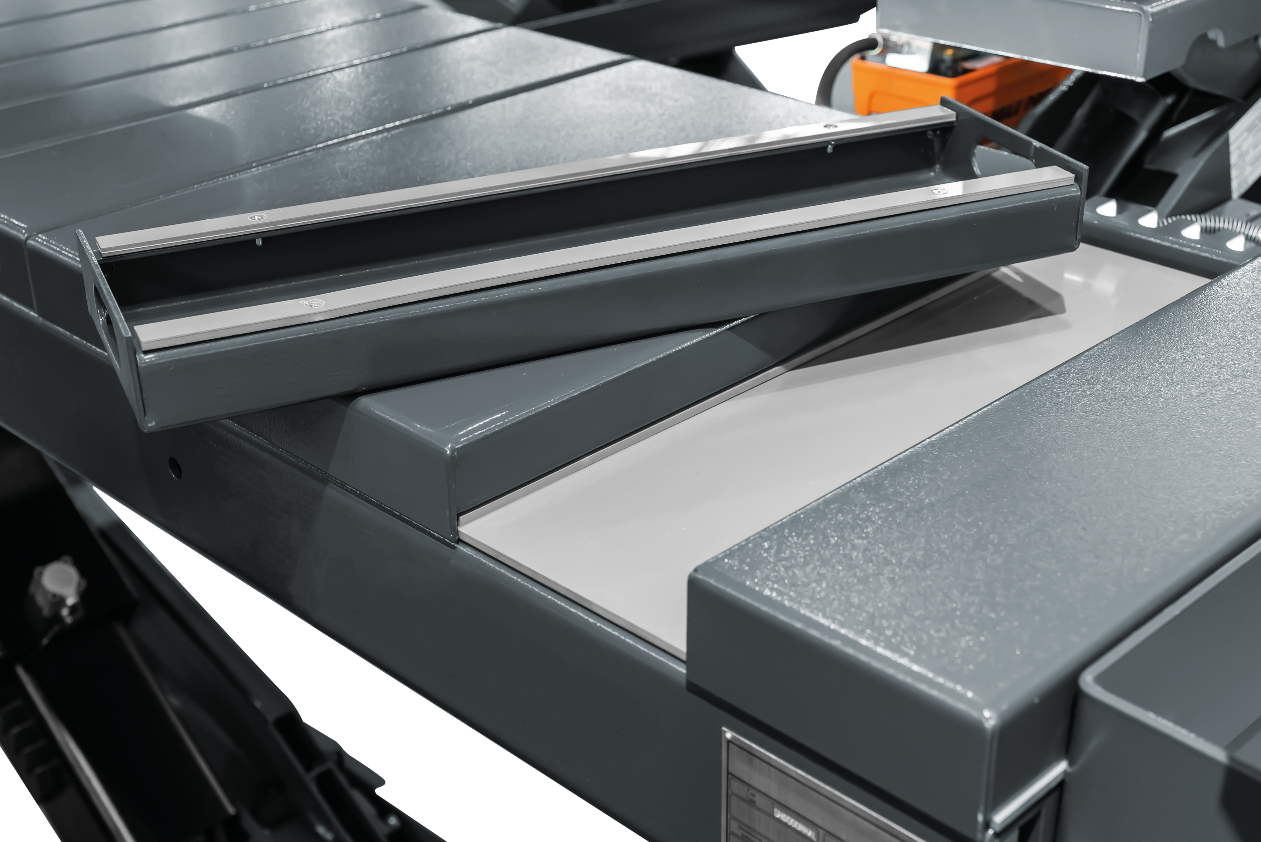 • Mit Aussparungen für Drehplatten vorne, mechanisch arretierbaren Schwingplatten hinten, Radfreiheber (Tragfähigkeit: 4 t, Hubhöhe: 450 mm), Laufschienen für den optionalen Achsfreiheber, steckbaren Querverbindungen, inkl. Metallschutzbügel und Schalter für die optionale 24V-LED-Beleuchtung